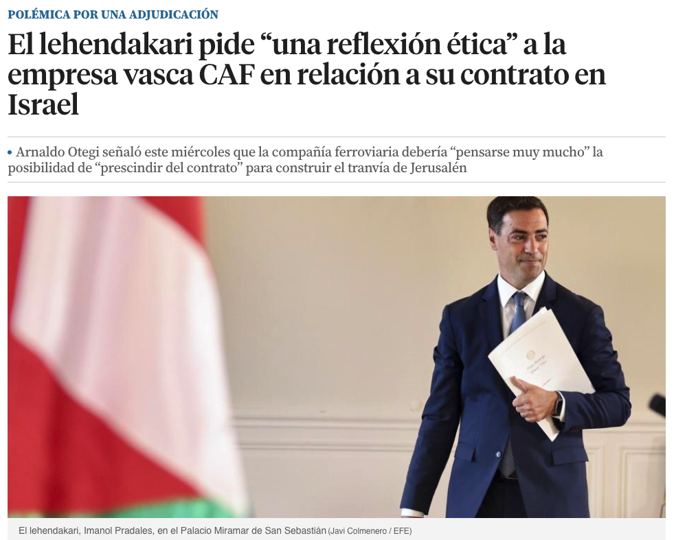 El setembre de 2025, Imanol Pradales, el lehendakari del Govern Basc, va demanar a CAF una ‘reflexió ètica’ sobre el seu paper en el tren lleuger de Jerusalem.