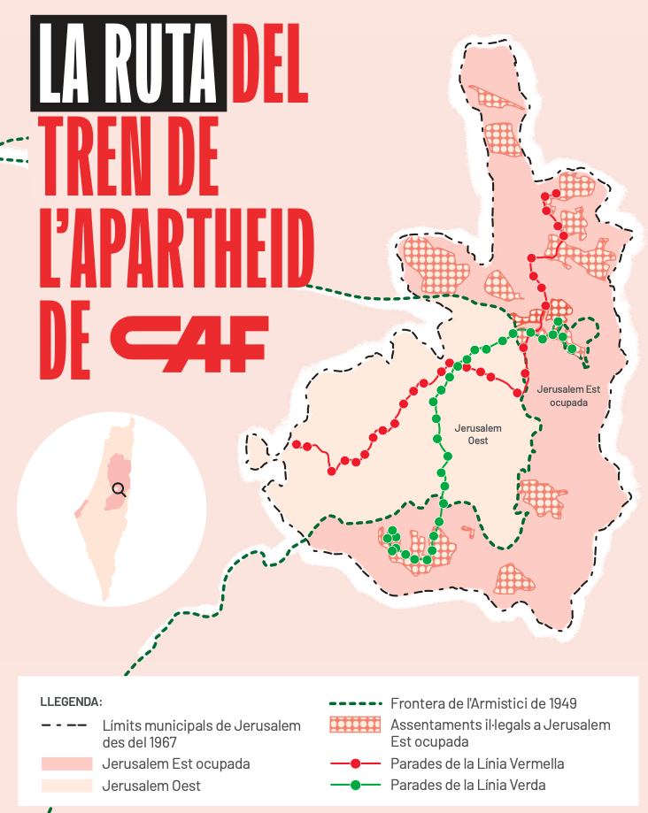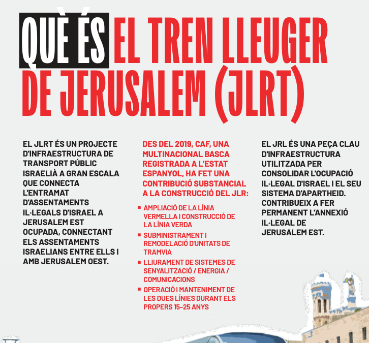 CAF està operant i ampliant la “Línia Vermella” del JLR i construint la nova “Línia Verda”, subministrant material rodant i serveis tècnics. Totes dues línies connecten els assentaments israelians il·legals al territori palestí ocupat amb Jerusalem Oest. Com a tal, el JLR contribueix a l’annexió il·legal de iure de Jerusalem Est per part d’Israel i facilita l’expansió dels assentaments.
