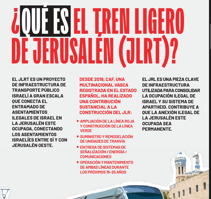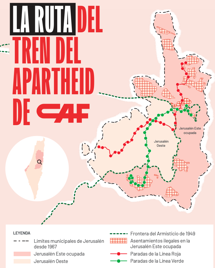 CAF está operando y ampliando la "Línea Roja" del JLR y construyendo la nueva "Línea Verde", suministrando material rodante y servicios técnicos. Ambas líneas conectan los asentamientos israelíes ilegales en el territorio palestino ocupado con Jerusalén Oeste. Como tal, el JLR contribuye a la anexión de iure ilegal de Jerusalén Este por parte de Israel y facilita la expansión de los asentamientos.